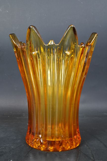 A collection of vintage retro mid 20th century glass to include a Whitefriars sea green vase with bubble control to body, a Czech Chribska Sklo Union Glassworks pink and orange two tone vase designed by Josef Hospodka and a Sowerby amber colour glass drip vase. Measures approx 20th tall. Chip to Whitefriars foot.
