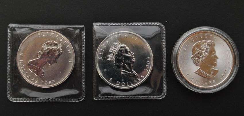 CANADA. Three 1oz 999 silver $5 dollars coins. The lot to include a 1989, 2003 & 2015 Canadian Maple Leaf $5 dollars coins. All having different Queen Elizabeth II right profiles to obverse, & maple leaf to reverse. Each weighing approx. 28gr.