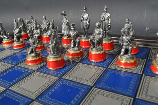A 20th century The Waterloo Museum 'The Waterloo Battle Chess Set' with chess board. The set having spare pieces and certificate of authenticity. Board measuring approx. 33 x 33cm.