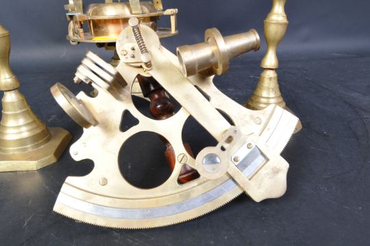 A collection of vintage 20th Century brass items. To include; a pair of candle stick holders on square bases, a Nauticalia reproduction sextant. Together with a reproduction surveying repeating theodolite. Tallest measures approx. 44cm