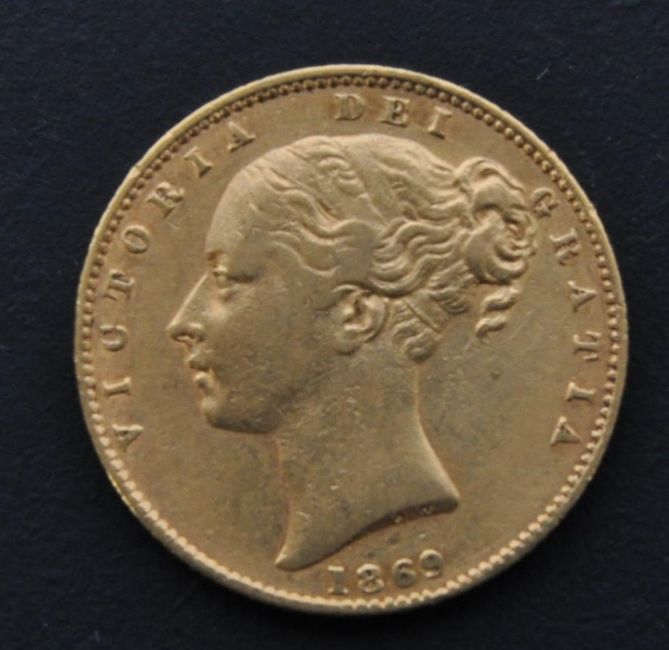 UNITED KINGDOM. Victoria, 1837-1901. Gold sovereign, 1869. London. Second young head of Victoria facing left, hair tied in fillet; date below truncation; VICTORIA DEI GRATIA. / Crowned shield within wreath; die number and national emblems below; BRITANNIARUM REGINA FID: DEF:. Weight 7.98grams, measuring approx. 22mm in diameter.