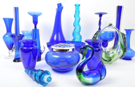 A collection of 20th Century studio art glass. Comprising of; An empoli style twisted textured vase., with a pair of twisted stem candle stick holders, Bristol blue vase (unmarked), grated flower holder, smaller shaped vases and with other later examples. Measures approx, 43cm tall.