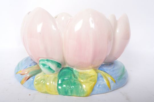 An Art Deco 20th century ceramic Clarice Cliff Newport Pottery lily pad shaped vase. Marked to base in green. It measures approx. 22cm long x 13cm tall.