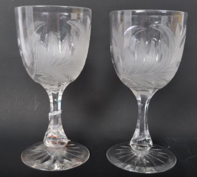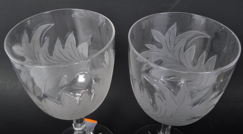 A pair of 20th Century acid etched wine drinking glasses. Having foliate embossed pattern to tapering round body into a curved panelled stem on a circular star base. Measures approx. 18cm
