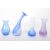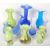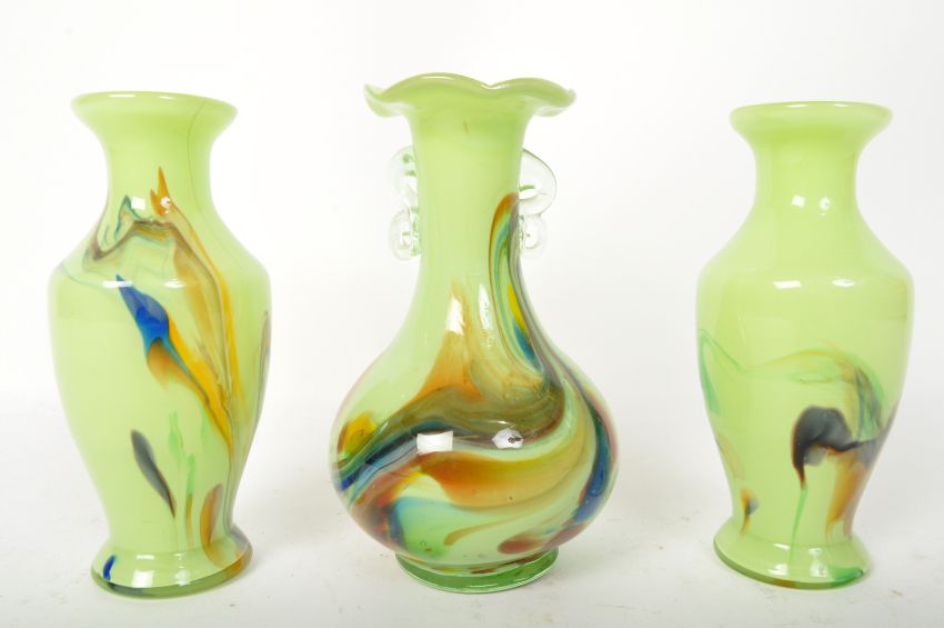 An assortment of vintage 20th century studio art glass items. The lot to include a set of opaque light green vases of various shapes & sizes, together with stem vases with ribbon rims vases in a blue colourway. Tallest measuring approx. 24cm tall.
