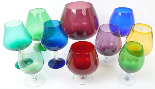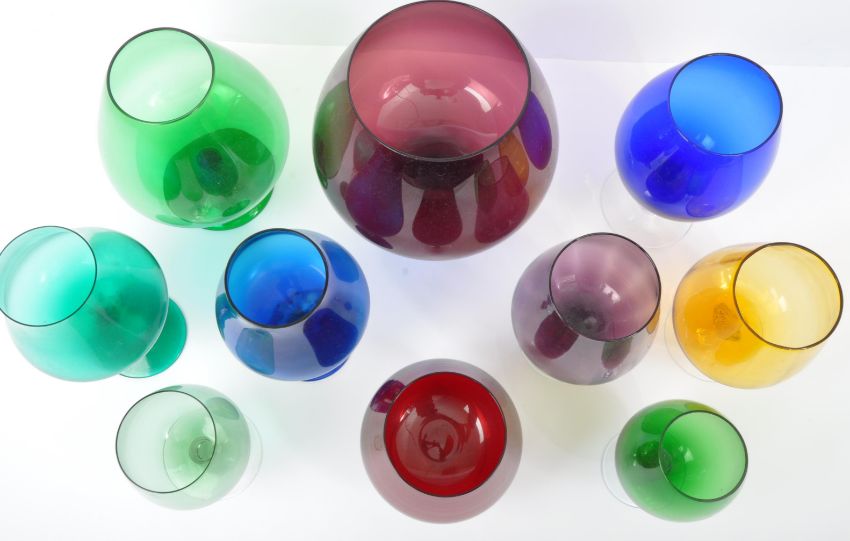 A collection of retro vintage 20th Century stemmed coloured bowl glasses. With a arrange of various sizes and colours. No makers mark. Measures approx. 22cm high 18cm dia.