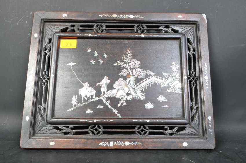 A 20th century Chinese abalone inlaid hardwood serving tray / wall plaque. The piece having inlaid abalone figural scene to depict Chinese farmers tending to their cattle in rural scene with pierced border featuring Chinese knots to the surround. Measures 42cm x 32cm.