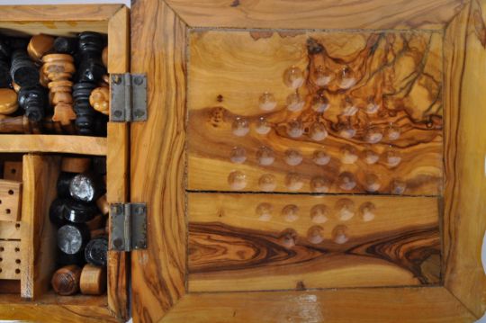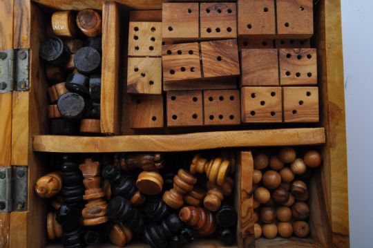 A 20th century burr walnut games compendium. The games box to include draughts, chess, solitaire & dominos. The compendium having scalloped edges with chess board to top. It measures approx. 20 x 20 x 6cm.