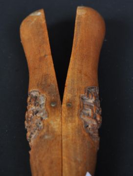 A 19th Century carved wood peg / paper clip holder. Having intricate carved small detailing of Asian oriental scene of people and foliage. Measures approx. 27cm long.