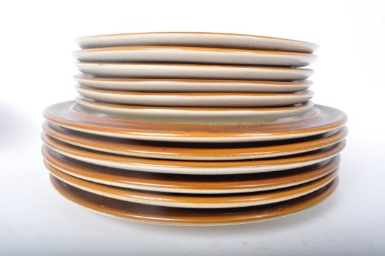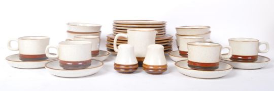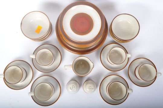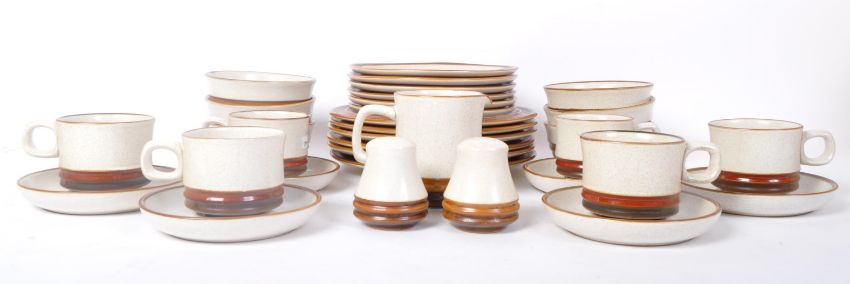 A retro vintage 20th Century Denby Stoneware tea dinner service set. Comprising of; cups, saucers, bowls, salt & pepper shaker, dinner plates, side plates. Marked to verso.