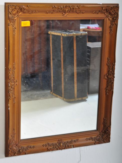 A 19th century gilded wooden wall hanging mirror. The mirror having rocaille spandrels to frame carved in relief. Measures approx. 69cm x 54cm