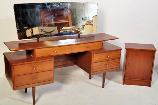 Frank Austin - Austinsuite - An original retro 1960's teak wood dressing table and bedside cabinet. The dressing table of large mirror to the top over  banks of three drawers with lipped handles and a central kneehole recess with drawer to the frieze. Raised on trestle type legs. Measures approx. 113cm x 148cm x 43cm