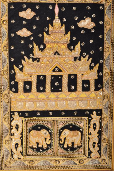 A pair of vintage 20th century framed Burmese Kalaga tapestry wall hanging artworks. The tapestries depicting temples & elephants with beads and translucent fabric. Each measuring approx. 91cm x 61cm.