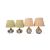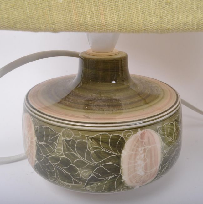 A pair of mid 20th Century Jersey pottery table lamps, complete with two green lamp shades. Together with two other mid 20th Century table lights, with marks to underside. One has been repaired. Measures approx. 26cm tall.