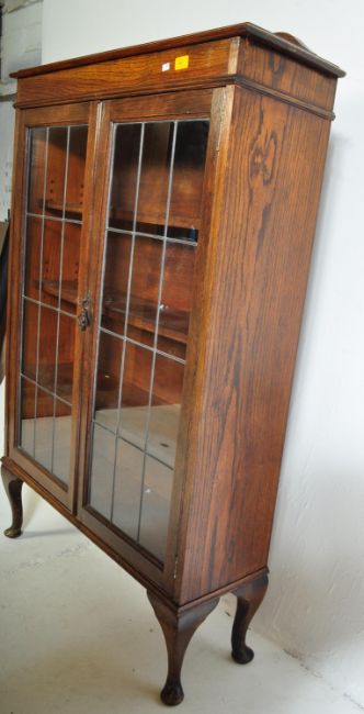 An early 20th Century 1920's oak & lead glass display vitrine cabinet. Of rectangular form with twin glazed leaded doors opening to a shelved interior with a hanging metal pull raised on stumped cabriole legs. Measures approx. 144cm x 93cm x 28cm.