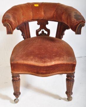 A 19th century late Victorian mahogany horse shoe shaped library desk chair in the manner of Gillows. The chair having bowed button back horseshoe back rest over sprung seat upon turned reeded supports on later castors. Measures approx. 81cm x 71cm x 55cm.