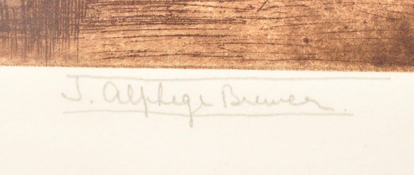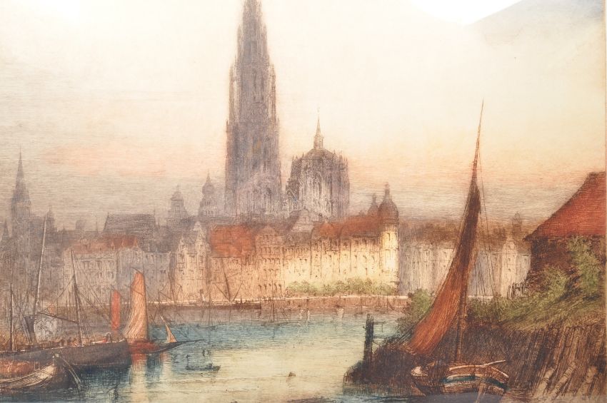J. ALPHEGE BREWER (1881 - 1946) - Two early 20th century coloured etchings by the English artist J. Brewer. The lot to include a large etching of the rose window in Reims Cathedral, signed and titled to bottom, together with a harbour view of the city of Antwerp, signed and titled to bottom. Both framed & glazed. Largest measuring approx. 82 x 60cm.