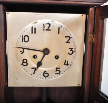 A 1920's oak Art Nouveau French 8 day drop dial wall clock. Oak case with silvered dial, inset 8 day movement with glass pendulum window. Measures approx. 62cm x 32cm x 18cm.