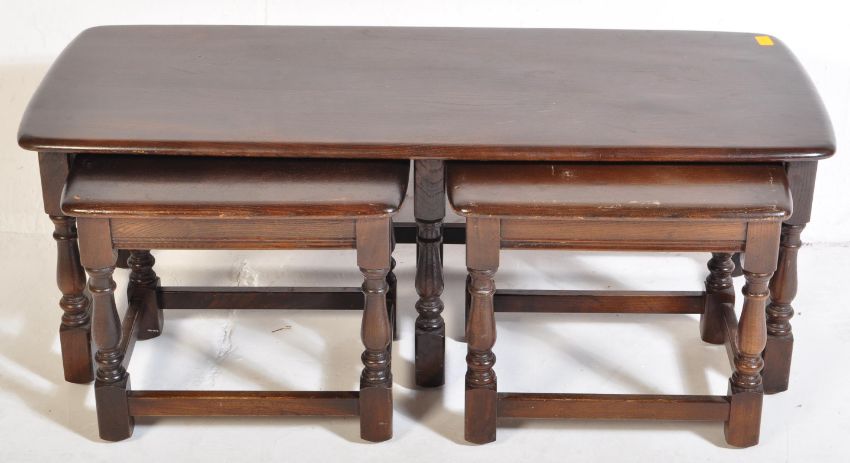 Ercol - Old Colonial - A mid 20th century retro vintage dark elm Ercol nest of tables comprising of larger rectangular table with two smaller beneath. Measures approx. 42cm x 114cm x 50cm.