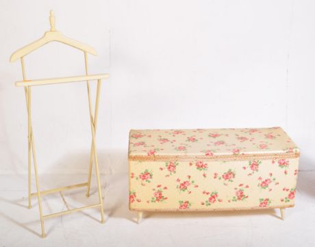 A retro 20th Century blanket box / ottoman. Of rectangular form with floral Cath Kidston style pattern raised on angled feet. Together with a gentleman's folding suit holder in a cream colourway. Measures approx. 44cm x 90cm x 36cm.