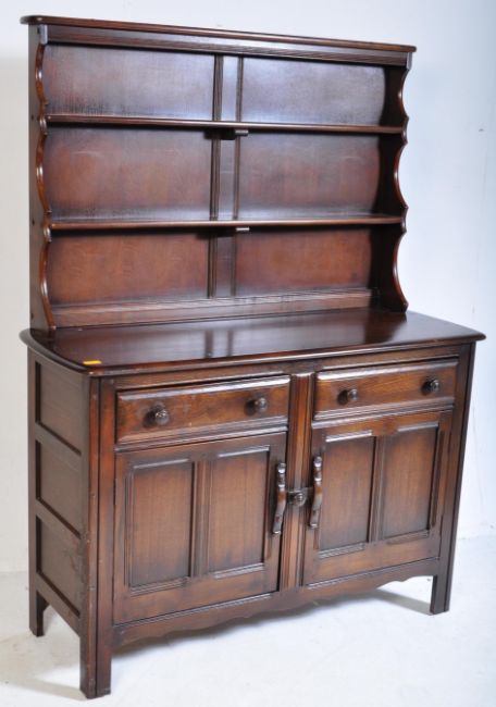 A mid century Ercol beech and elm wood dresser. Raised on stile legs with the base comprising of  a series of drawers and cupboards having elm top above. Finished with an upright stage gallery back  / plate rack with shaped pediment atop. Measures 170 x 136 x 50cm.