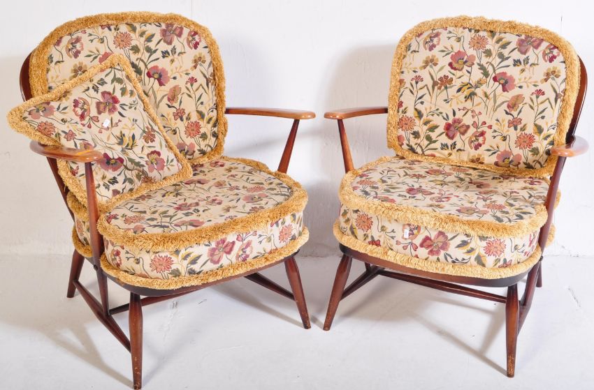 A pair of mid 20th Century dark beech and elm Ercol Windsor low arm chairs. Having a curved spindle back rest with straight arm rests, with stumped tapering angled legs with stretchers. Both having floral drop in padded cushioned seats. Measures approx. 77cm x 68cm x 72cm.