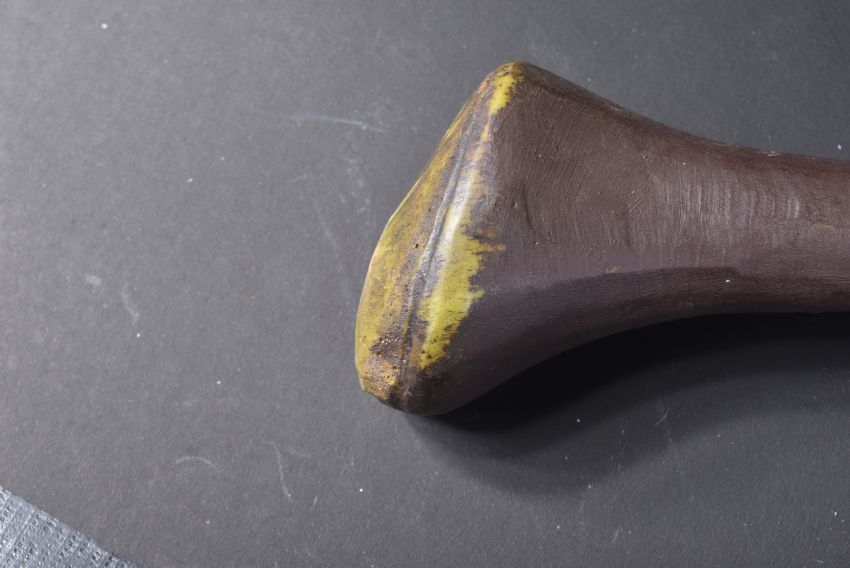 The Mummy Returns (2001) - an original production used prop axe from the movie. Handle of rubber construction, with a foam latex blade. Aged and painted with the appearance of metal. Wear from use during production, the axe head with a split at the join to the shaft (not separated, still holding). Measures approx; 110cm long.