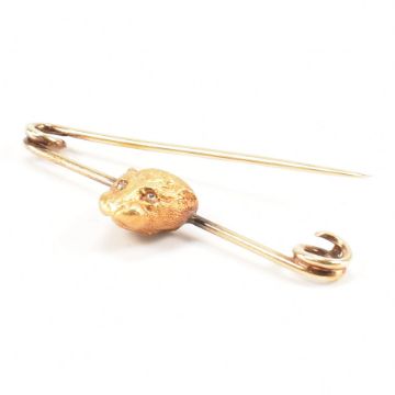 A 19th Century gold and diamond figural brooch pin. The antique brooch being set with an applied otter head with diamond set eyes on a safety pin brooch. Unmarked, tests indicate 18ct gold to brooch. Measures 4.5cm wide. Weight 4.5g. In antique box.