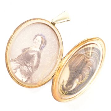 A 19th Century Victorian 18ct gold garnet and seed pearl mourning locket. The locket of oval form set with an oval garnet cabochon with a halo of seed pearls. Engraved Anne Stiles Obt Aug 14th 1874 to verso. Photograph and hair panel to interior. Marked 18ct. Measures 6cm. Weight 40g.