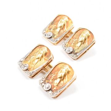 A pair of Art Nouveau 18ct gold and diamond cufflinks. The cufflinks having double heads with portraits of a maiden set with old cut diamonds. French assay marks to clip link. Weight 13.83g. Head measures approx 1.5cm.