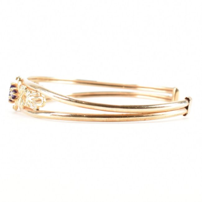 A hallmarked 9ct yellow gold & amethyst cuff bangle. The bangle having three graduating amethysts to the centre on a split bangle setting with moulded wire work style design to include heart motifs. Hallmarked for Birmingham together with common control mark, sponsors marks for M Ld. Central stone measures approx 6 x 4 x 2.5mm. Total weight approx 6.6g. Measures approx 6 x 4.5cm.