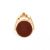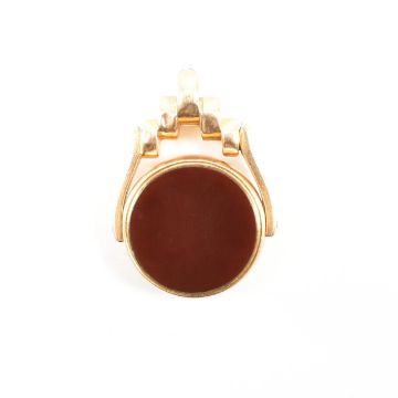 An Art Deco 15ct gold carnelian and bloodstone swivel fob. The fob having bloodstone and carnelian plaques surmounted by a terraced top to bale. Marks worn for 15ct. Tests indicate 15ct gold. Weight 5.8g. Measures approx 2.5cm.