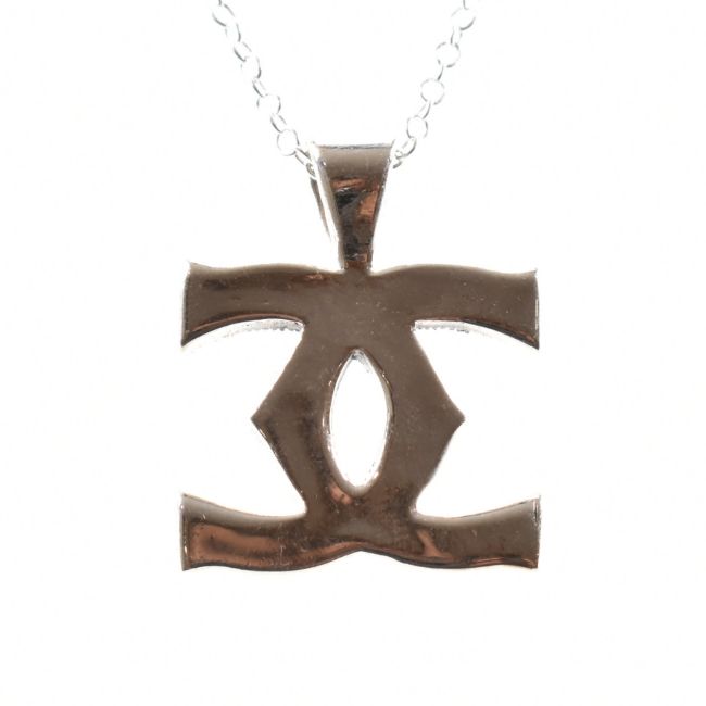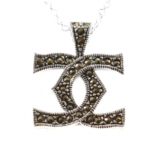 A 925 silver necklace chain together with marcasite set pendant. The pendant in the form of crossed C's monogram set throughout with marcasites on a silver fine cable link chain united by lobster claw clasp. Chain marked 925. Total weight approx 6.6g. Chain measures approx 45cm.