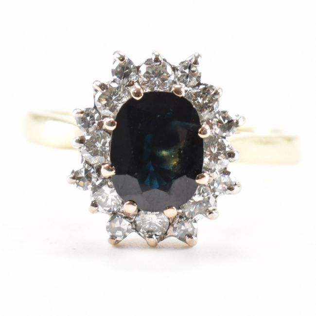 A hallmarked 18ct gold sapphire and diamond ring. The ring being set with an oval cut sapphire surrounded by a halo of round brilliant cut diamonds on a plain band. Hallmarked Birmingham 1981. Weight 4.5g. Size R. Sapphire measures 8 x 6.2 x 3.1mm. Diamonds approx 0.72ct in total.