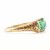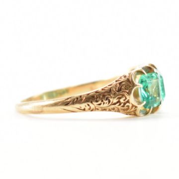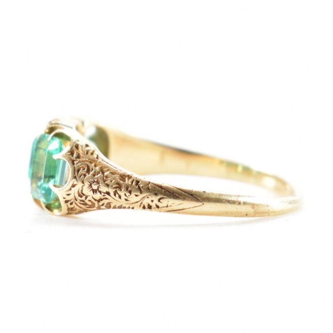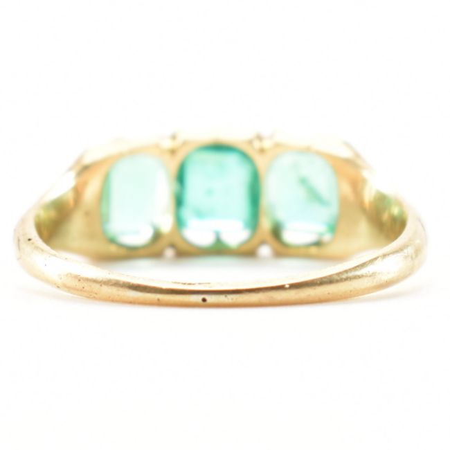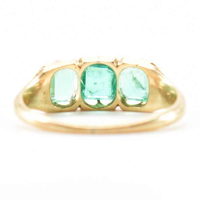 A 19th Century antique gold and emerald three stone ring. The ring being set with three square emerald cut emeralds with floral engraved shoulders. Unmarked, tests indicate high carat gold. Weight 2.2g. Size L.5.
