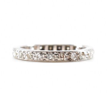 A vintage platinum and diamond eternity ring. The ring being set with round single cut diamonds throughout. Unmarked, tests indicate platinum. Weight 3.9g. Size N.5.