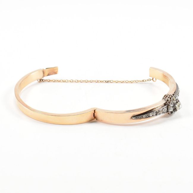 A French 18ct gold and diamond hinged bangle. The bangle set with a central cluster of old cat diamonds with V set shoulders to hinged wide body. Estimated diamond weight 1.5ct. Principle diamond approx 0.30ct. French assay marks to the clip clasp. Weight 6.19g. Measures internal circumference approx 20cm.