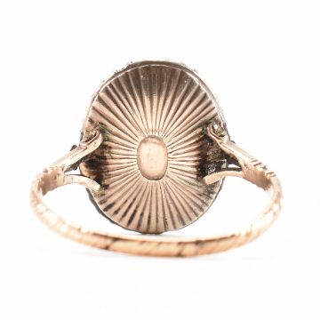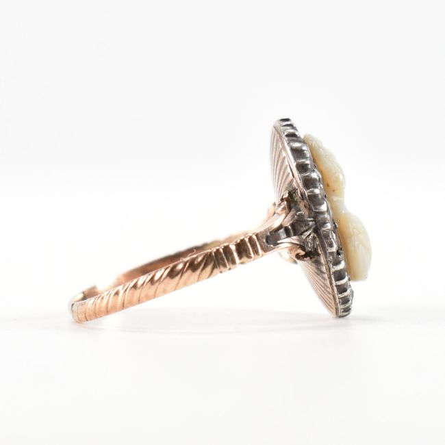 A Georgian antique gold and diamond cameo ring. The ring having a carved stone cameo to the centre featuring a female figure with clasped hands with a halo of faceted diamonds on a twist design band. Tests indicate 14ct gold to shank. Weight 3.7g. Size V. Heads measures approx 1.75 x 1.35cm.