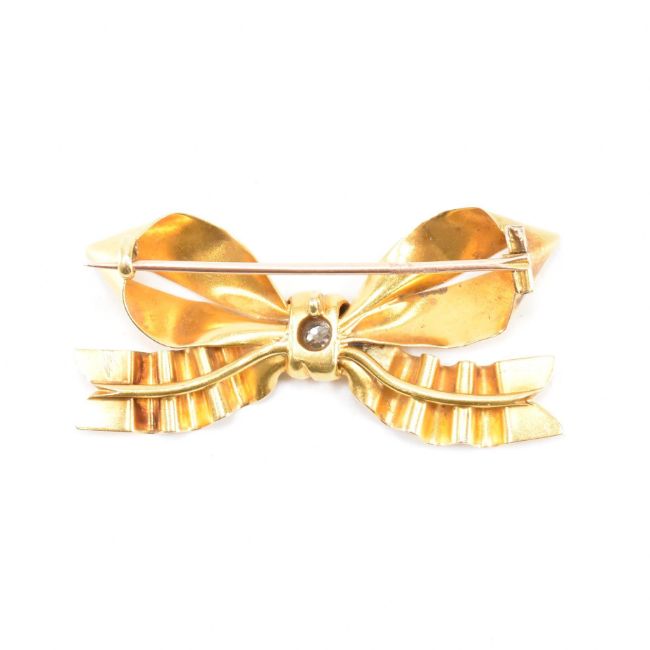 A 19th Century Victorian gold and diamond bow brooch. The brooch being set with an old cut diamond to the centre of the bow with a hinge pin to verso. Measures 5cm wide. Unmarked, surface tests indicate high carat gold.