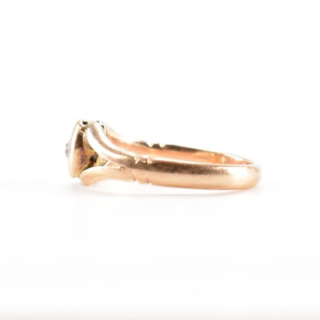 An Edwardian 9ct gold and diamond solitaire ring. The ring set with a single old cut diamond to split shoulders and plain shank. Estimated diamond weight 0.10ct. Weight 1.7g. Size G.5