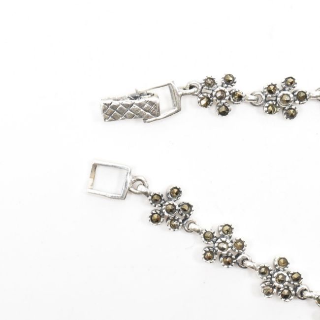 A silver marcasite & sapphire flower bracelet. The bracelet comprised of marcasite set daisy floral links with three oval cut blue stones to the centre. Unmarked. Total weight approx 14.2g. Measures approx 19.5cm.