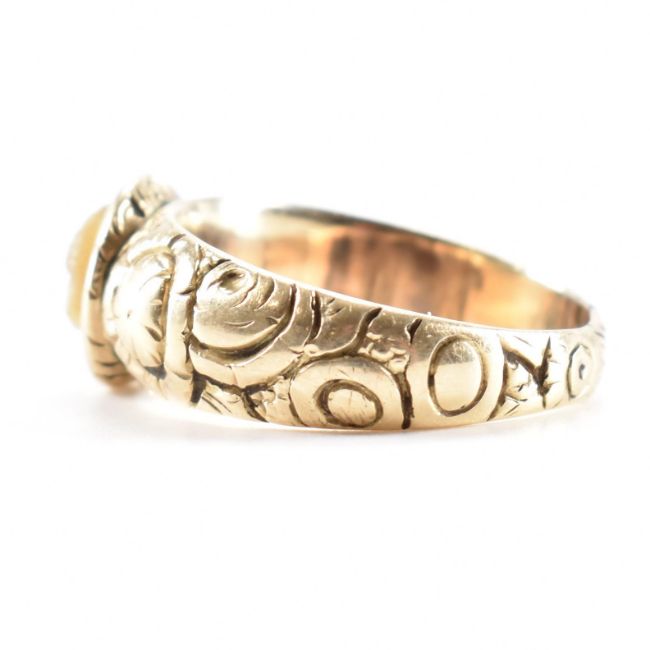 An antique Georgian yellow gold & cameo ring. The ring having a round bezel set carved cameo depicting a small child with an abundance of curly hair to etched textured shoulders on a tapered bank with repeating pattern throughout. Unmarked, surface tests indicate predominantly approx 14ct with a small section to the back testing as lower carat. Total weight approx 5.1g. Approx size O.