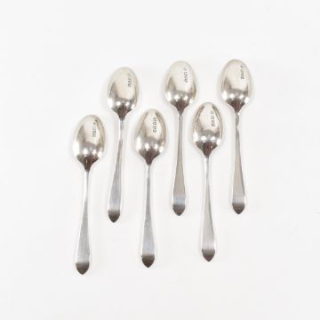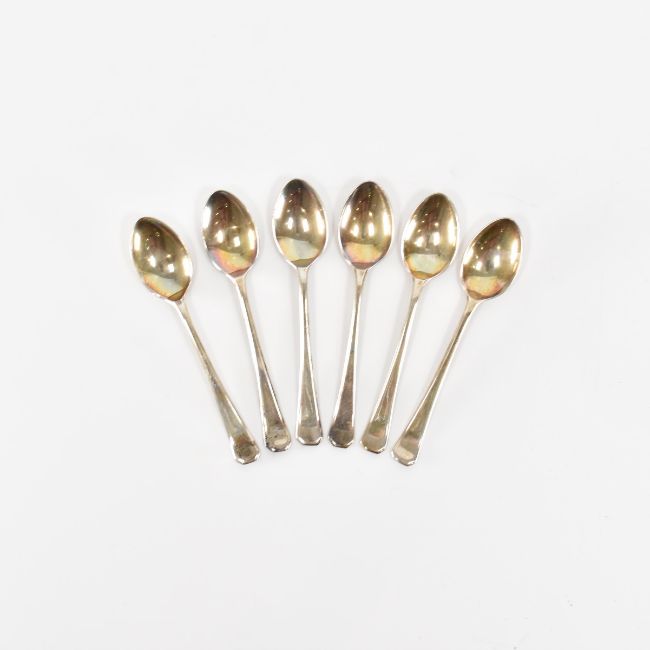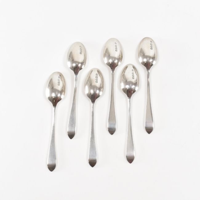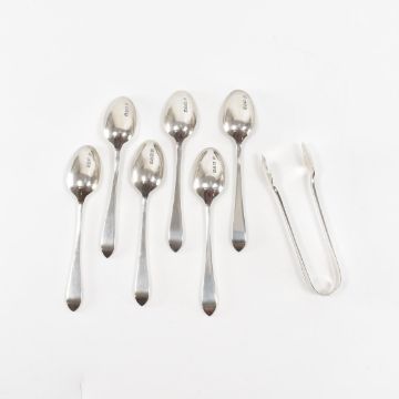 Two sets of silver hallmarked teaspoons. The first set having six teaspoons complete with silver sugar tongs. Housed in original case. The Spoons having a Sandringham pattern to the stem and handle. Hallmarked Chester, 1917. Marked Barker Brothers. The Second set, also having six teaspoons, hallmarked Sheffield, 1947. Marked BH.  Weight of both sets (excluding boxes) 139.19g. Total weight 549.61g. Spoon from first set measuring 12cm. Spoon from second set measuring 9.5cm.