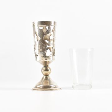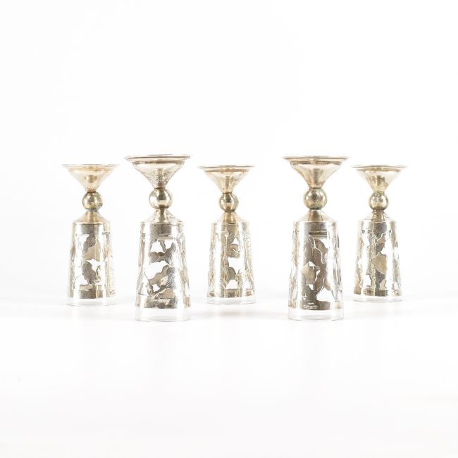 A set of five matching bud glasses.The glasses having a sterling silver case with rose detailing. Encasing a detachable glass vessel. Marked Sterling. Total weight 158g. Measures 9cm.