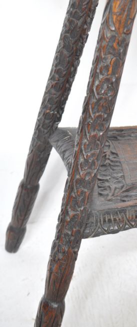 A 19th Century Anglo-Indian hand carved hardwood centre table / side occasional wine table. Carved inverted square top with scrollwork detailing raised on four carved splayed legs united by lower tier stretcher. 60cm x 39cm x 53cm.