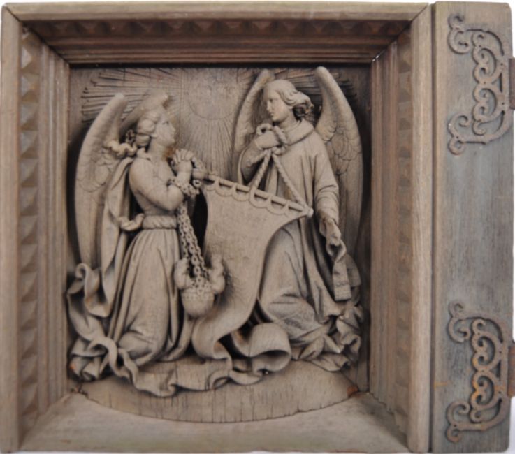 A rare and important pair of carved wooden doors Circa 1600 English depicting the four continents Europe Africa Asia & America during the early discovery of them. Square form with the Continents depicted as Angels wearing symbolic items in relief held within period fittings / frames. Likely taken from a large piece of Ecclesiastical furniture around the time of the reformation and hidden. Measures approx; 54cm x 64cm x 12cm.