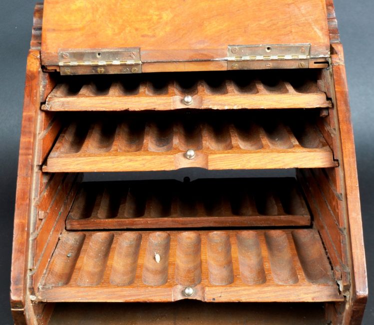 A 19th Century walnut humidor box of unusual form having hand painted decoration depicting birds on branch. Hinged front opening to reveal Humidor cigar section with white metal handle above. Measures approx; 26cm x 23cm x 34cm.