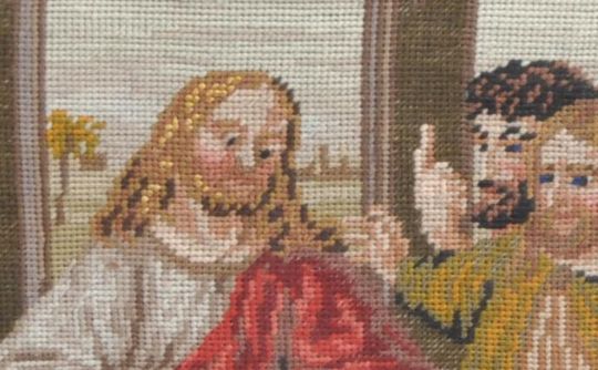 A large 19th Century Victorian embroidery religious ecclesiastical needlepoint tapestry depicting The Last Supper with Christ & Disciples. Coloured thread used to highlight figures and features. Set to a large gesso glazed frame. Measures approx; 72cm x 104cm.