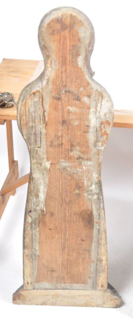 An 18th century carved oak religious ecclesiastical figurine depicting a religious figure. The figure with remains of polychrome decoration and modelled standing in long robe with hands in prayer. Measures approx. 116cm tall.