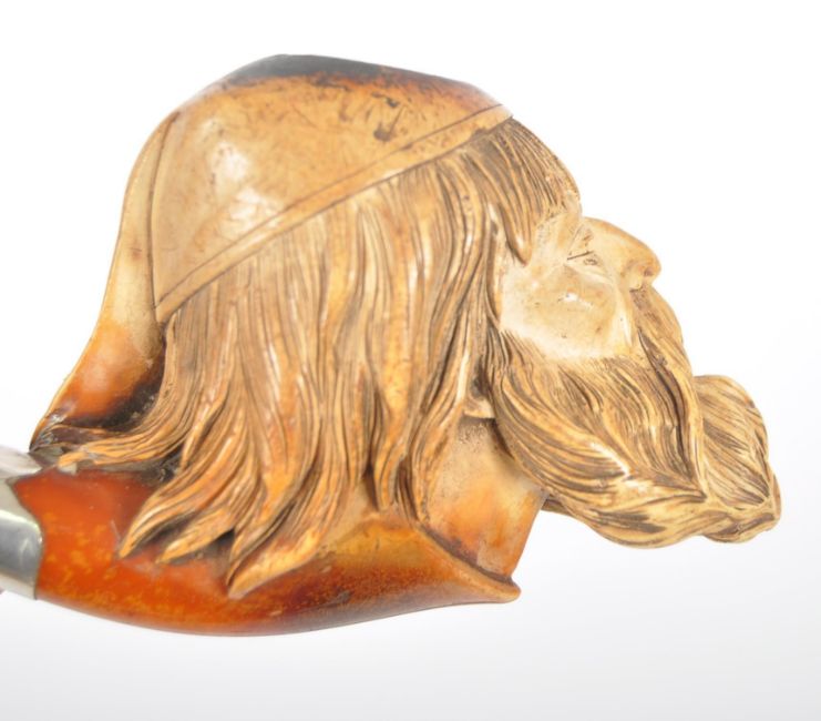 An early 20th century meerschaum tobacco pipe carved in the form of a bearded gentlemen wearing a night cap . The stem being formed of amber with incised silver hallmarked collar. Measures 20cm length.